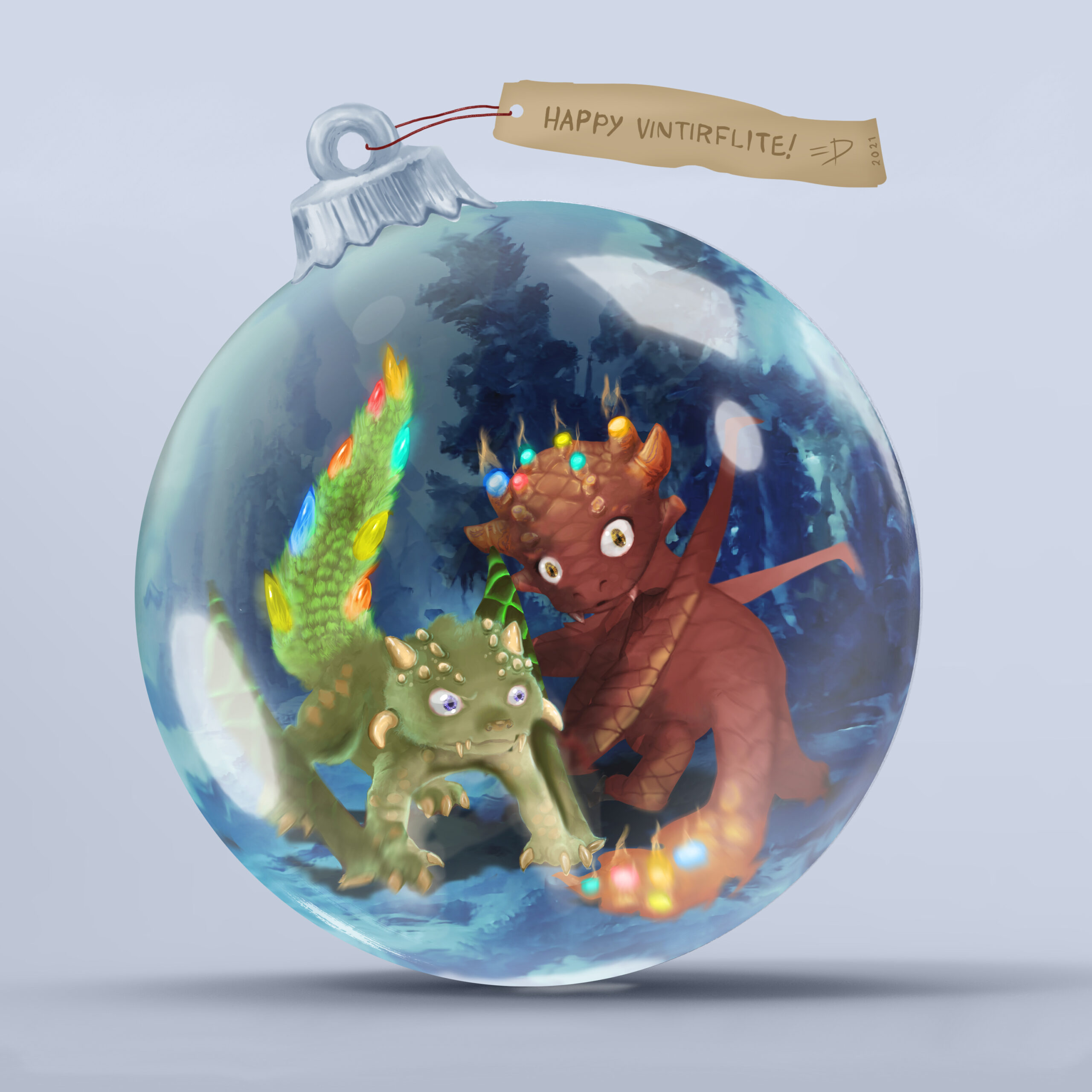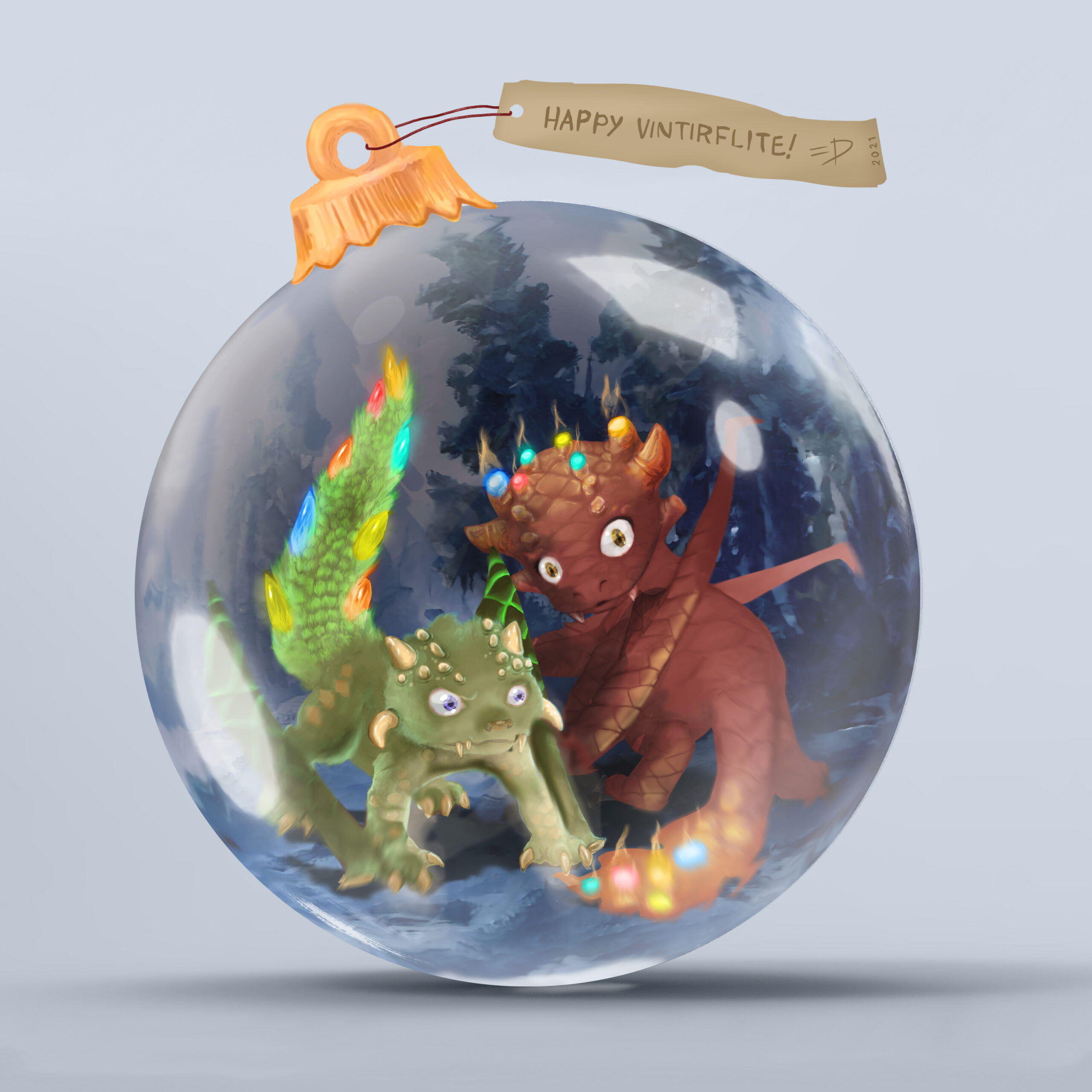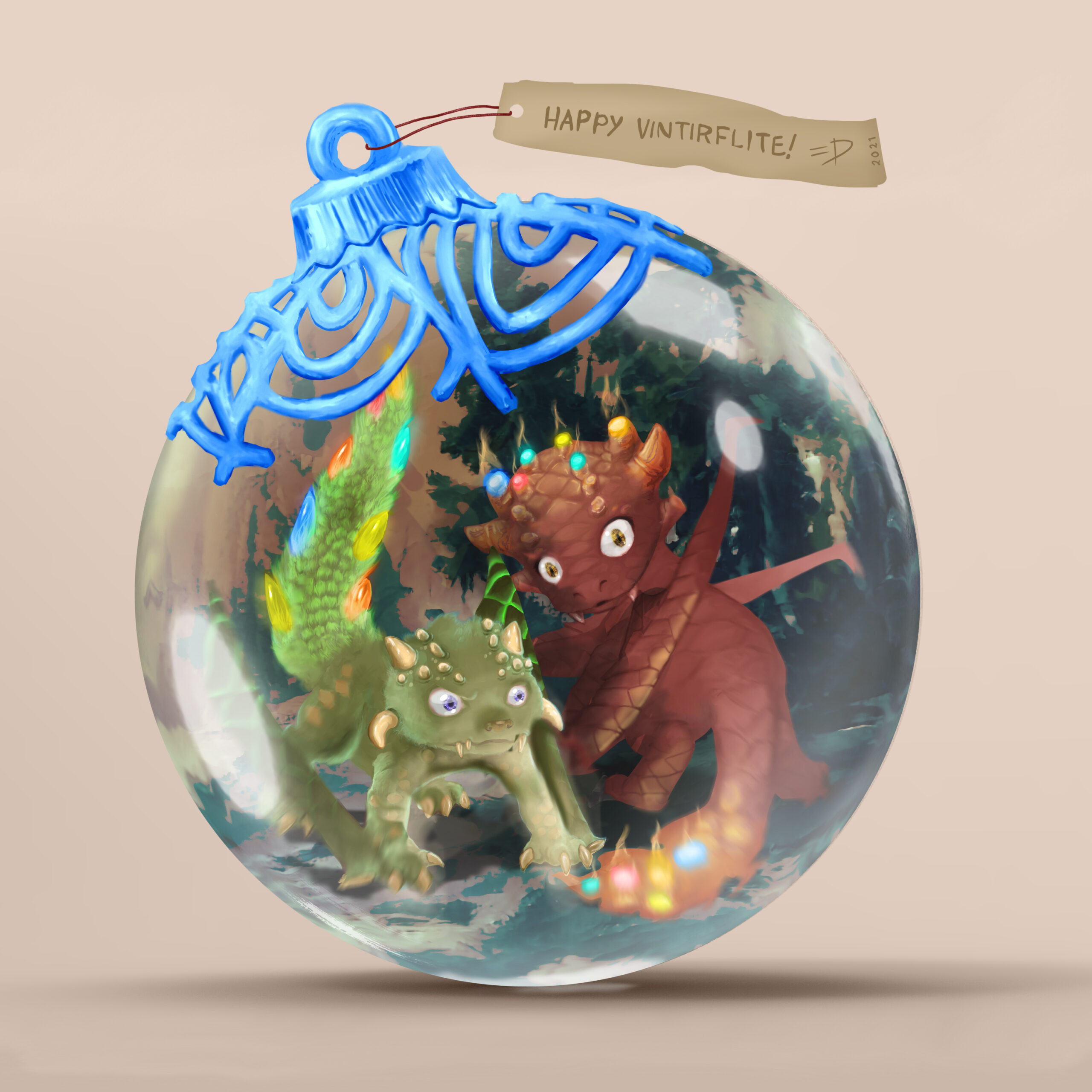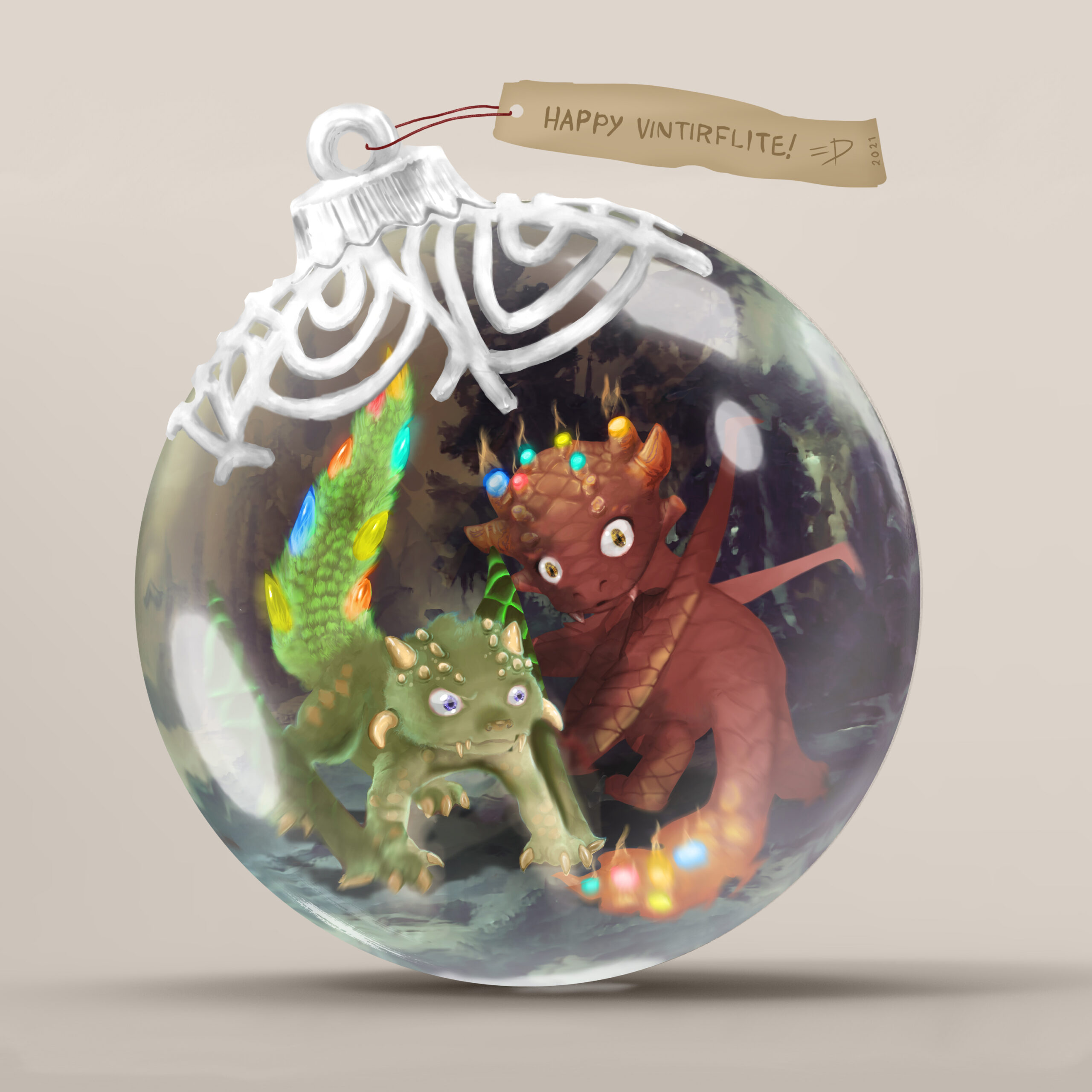 In the world of Yiden, Vintirflite heralds feasts and celebrations as the season musters settlers and wanderers from across the tundra to the warmth of their familial homes in preparation for a long wintry rest. As the first snowfall arrives, evergreens are decorated with colorful baubles and beads. Alit, the ancient trees become perfect gathering points to share the myths and legends of Vintirflites past, when Dragons took to the skies guided by their Knightly keepers.
