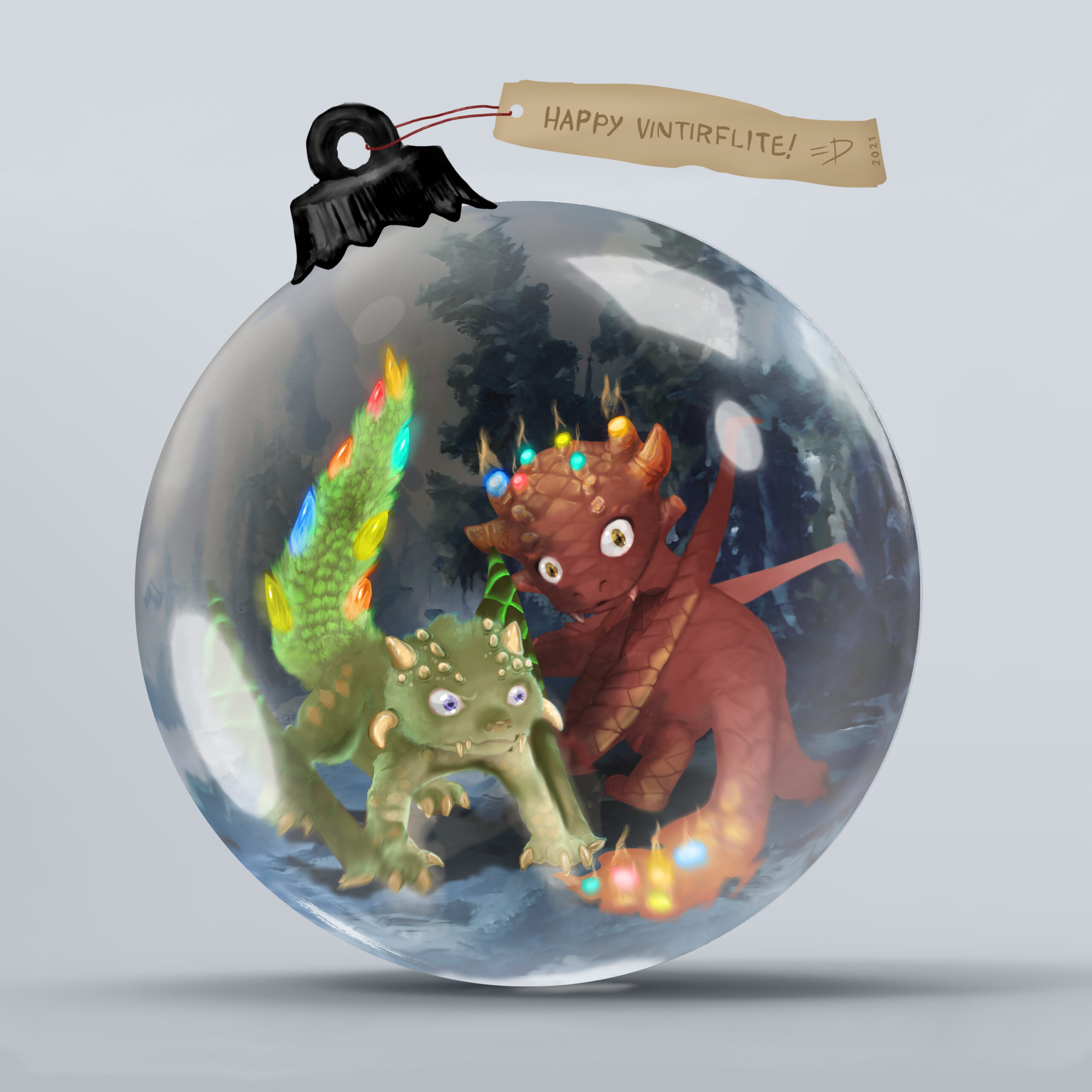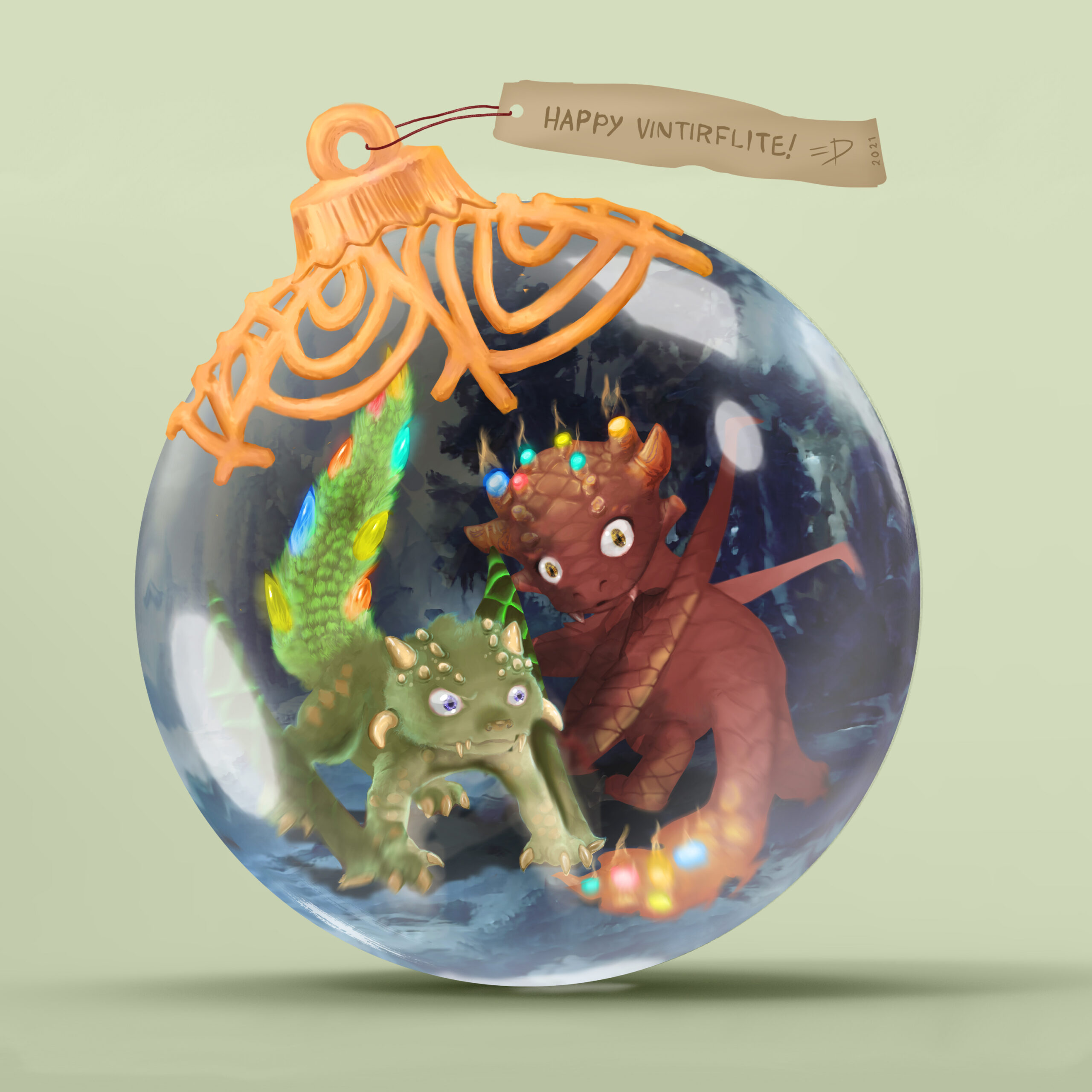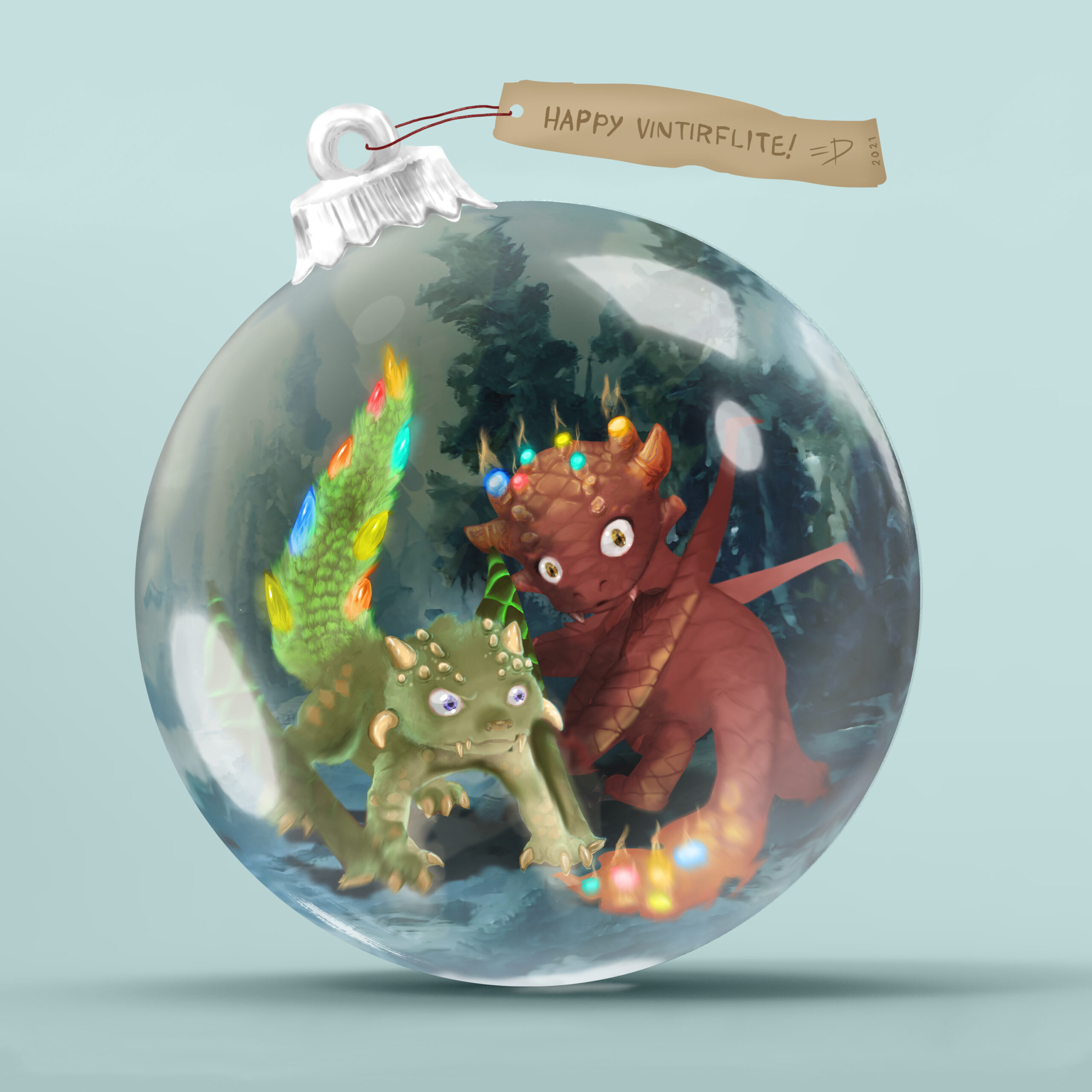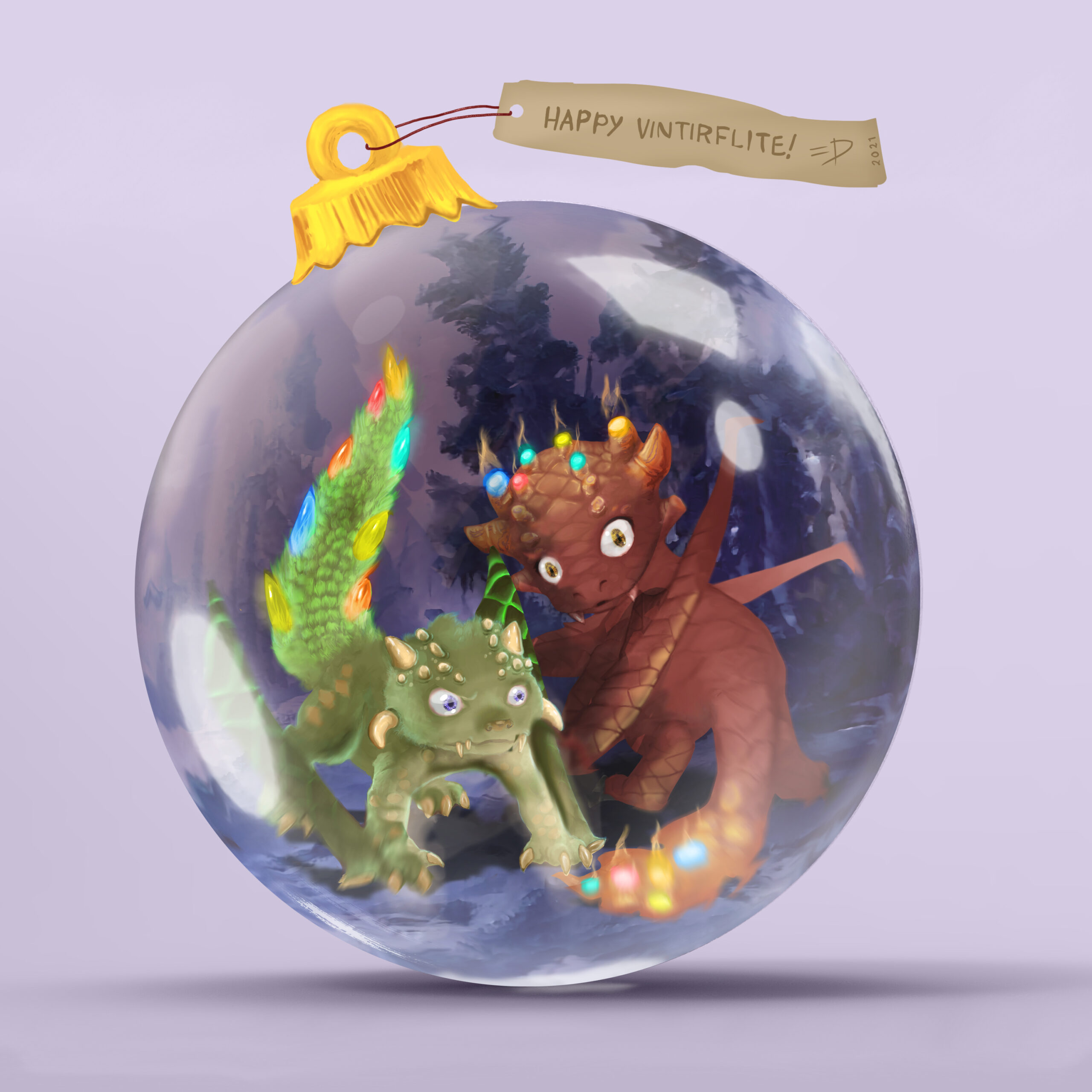 In the world of Yiden, Vintirflite heralds feasts and celebrations as the season musters settlers and wanderers from across the tundra to the warmth of their familial homes in preparation for a long wintry rest. As the first snowfall arrives, evergreens are decorated with colorful baubles and beads. Alit, the ancient trees become perfect gathering points to share the myths and legends of Vintirflites past, when Dragons took to the skies guided by their Knightly keepers.