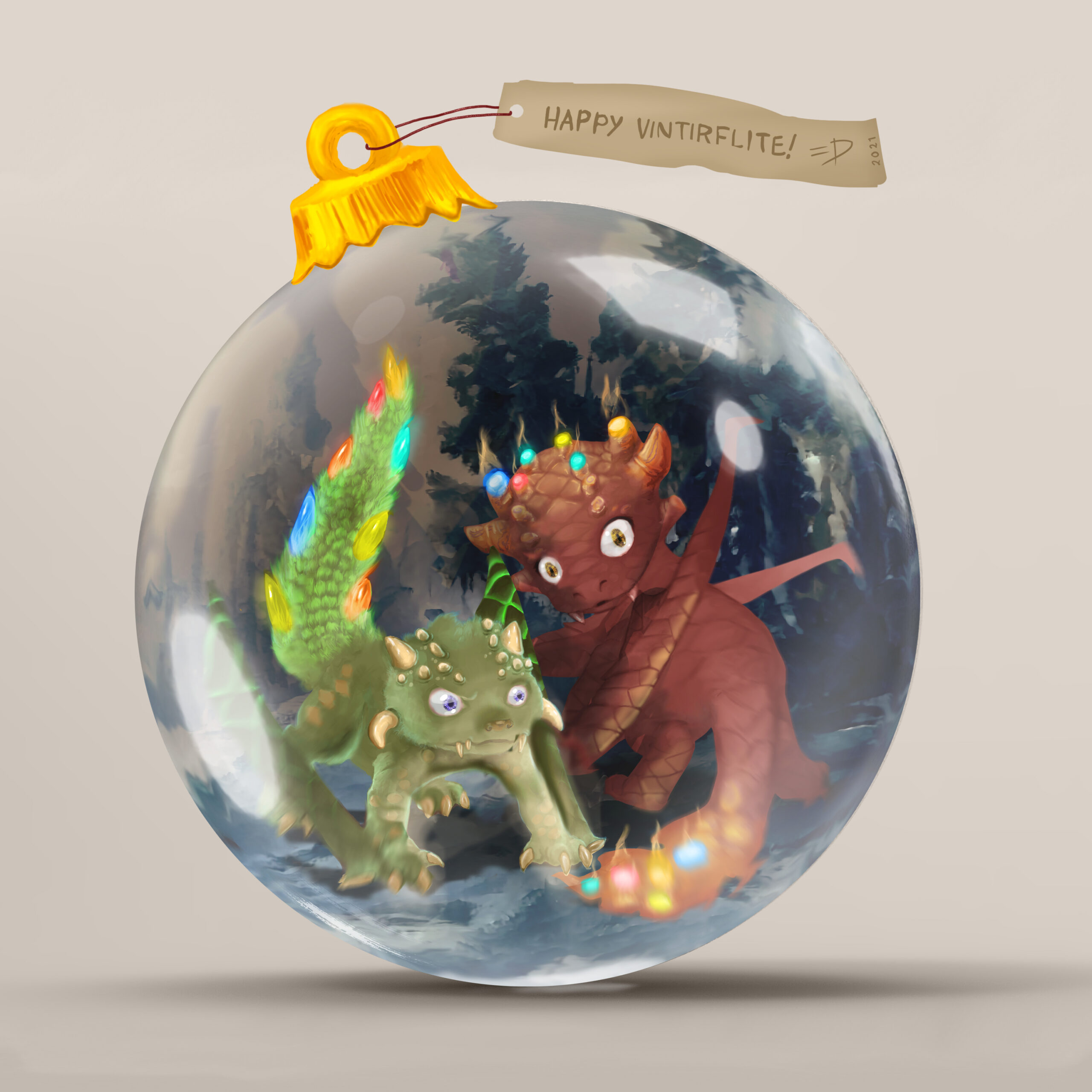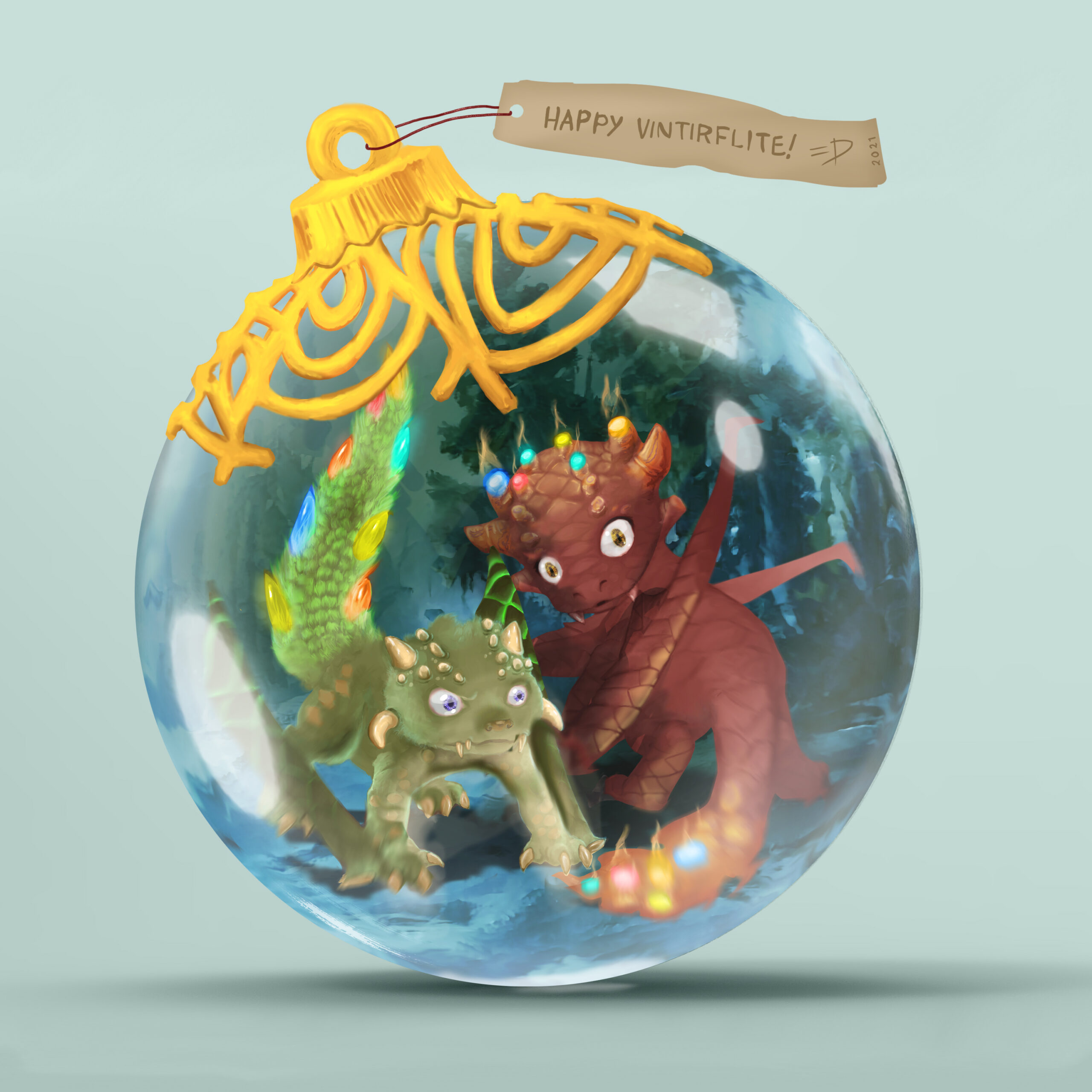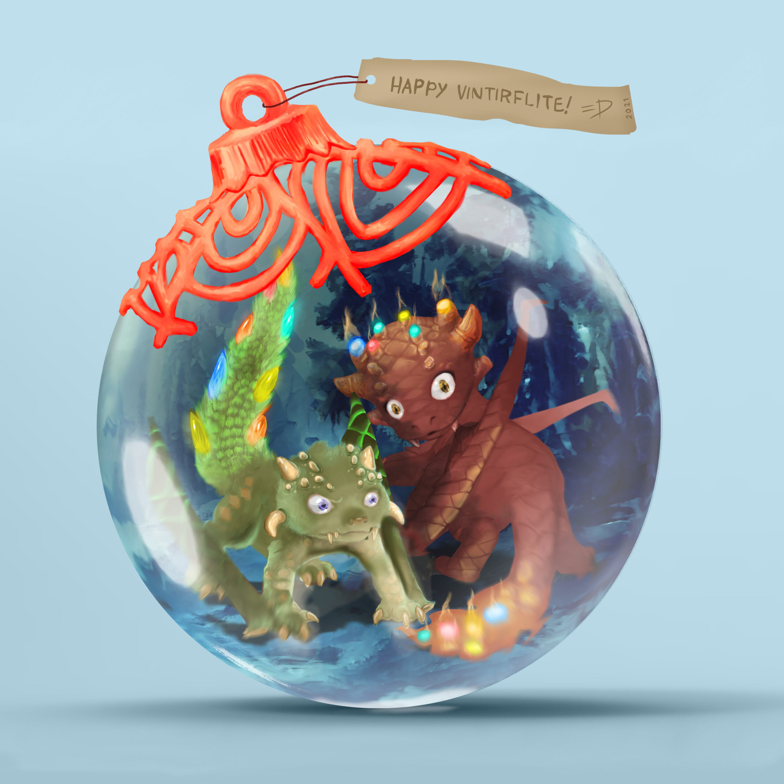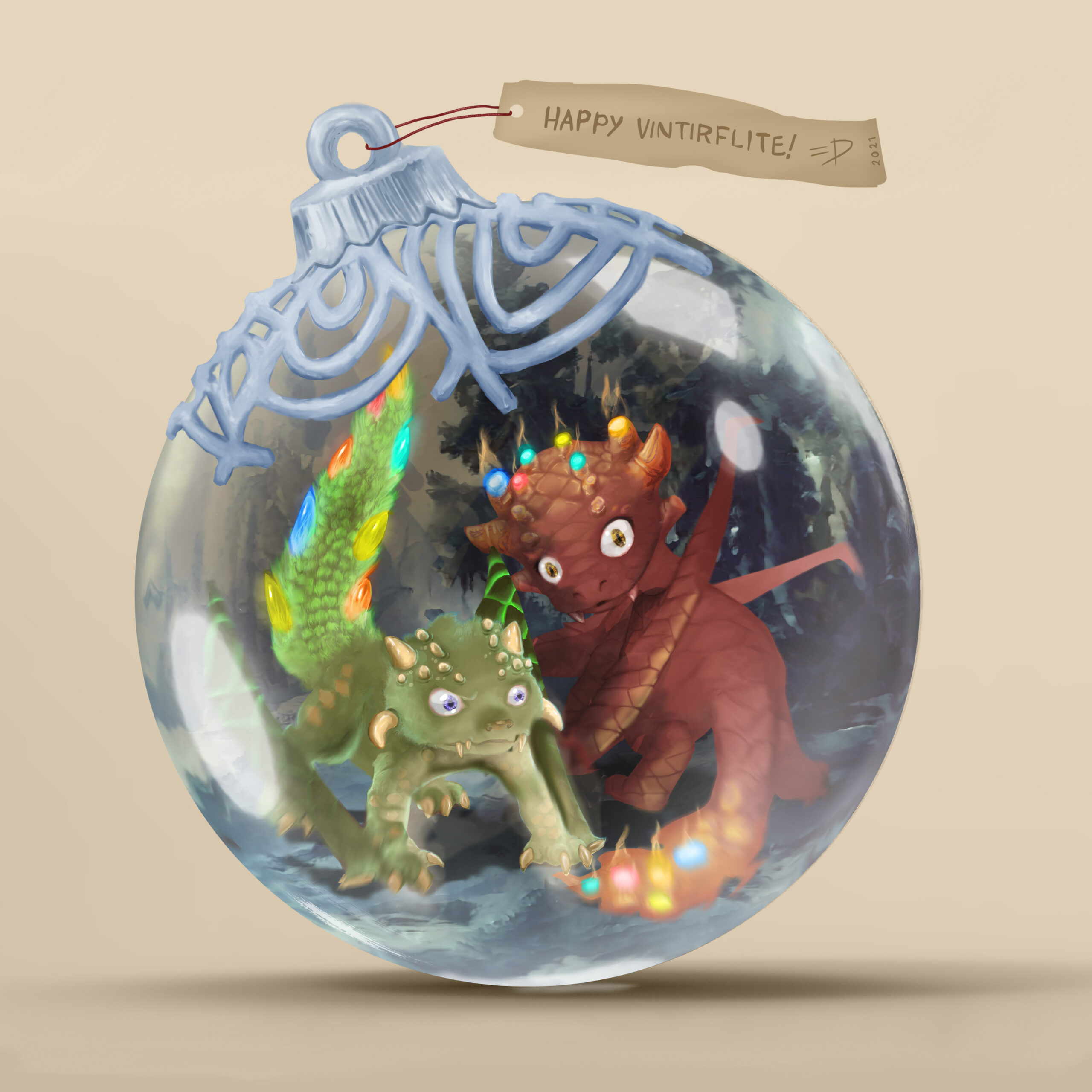 In the world of Yiden, Vintirflite heralds feasts and celebrations as the season musters settlers and wanderers from across the tundra to the warmth of their familial homes in preparation for a long wintry rest. As the first snowfall arrives, evergreens are decorated with colorful baubles and beads. Alit, the ancient trees become perfect gathering points to share the myths and legends of Vintirflites past, when Dragons took to the skies guided by their Knightly keepers.