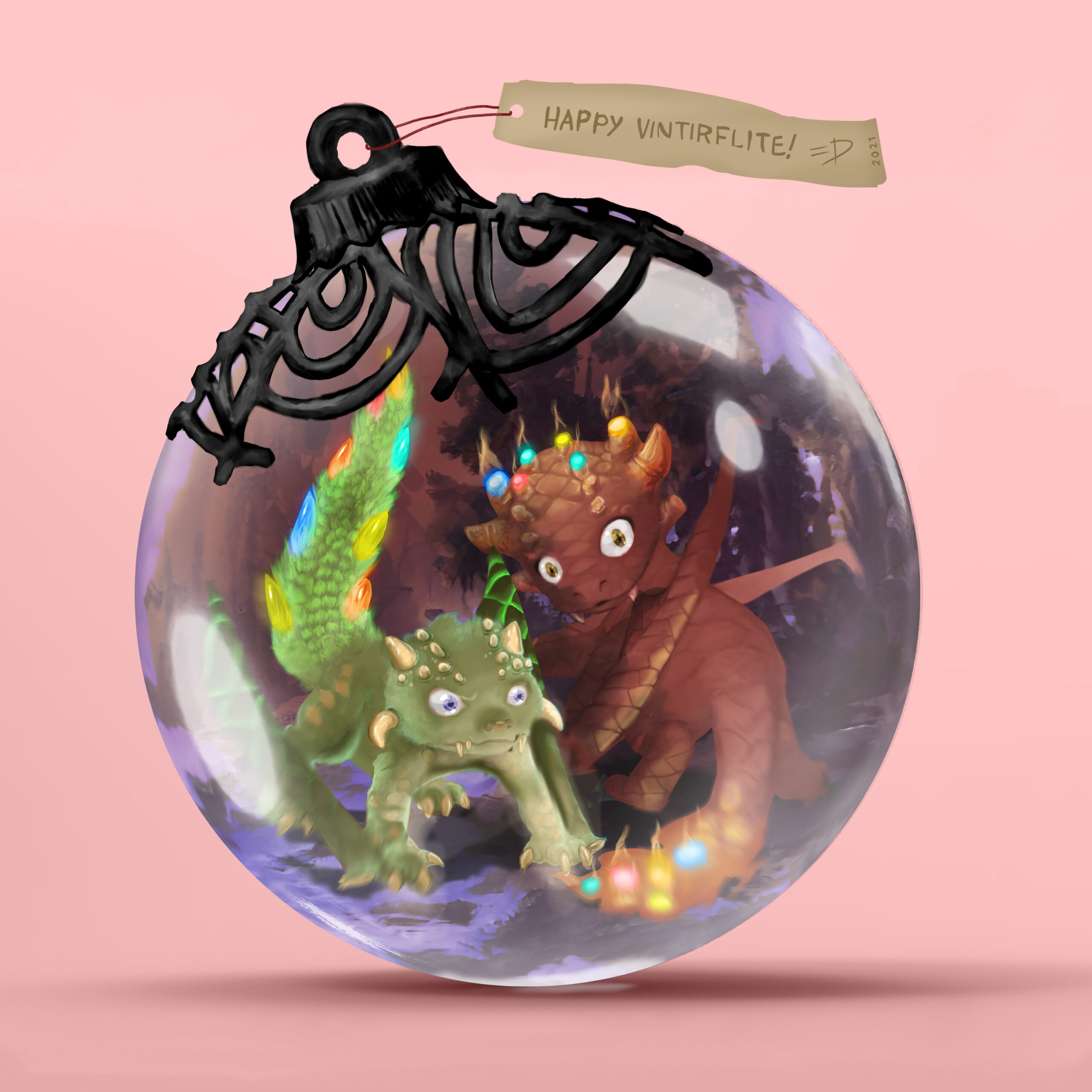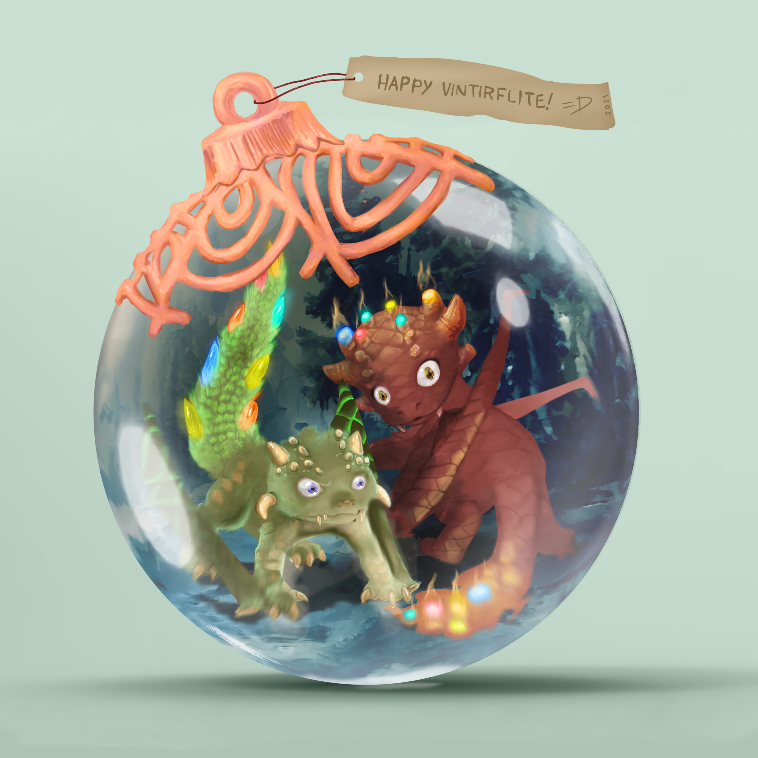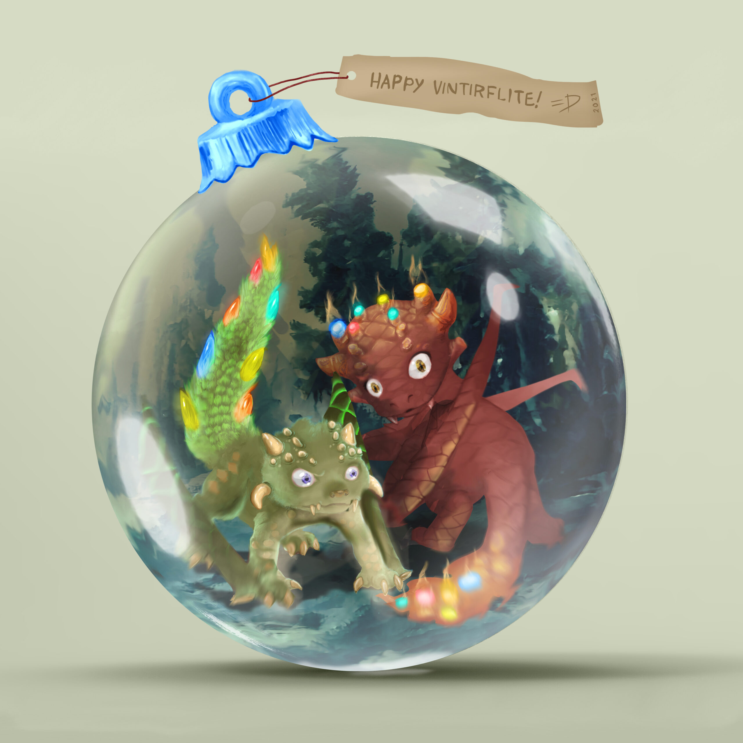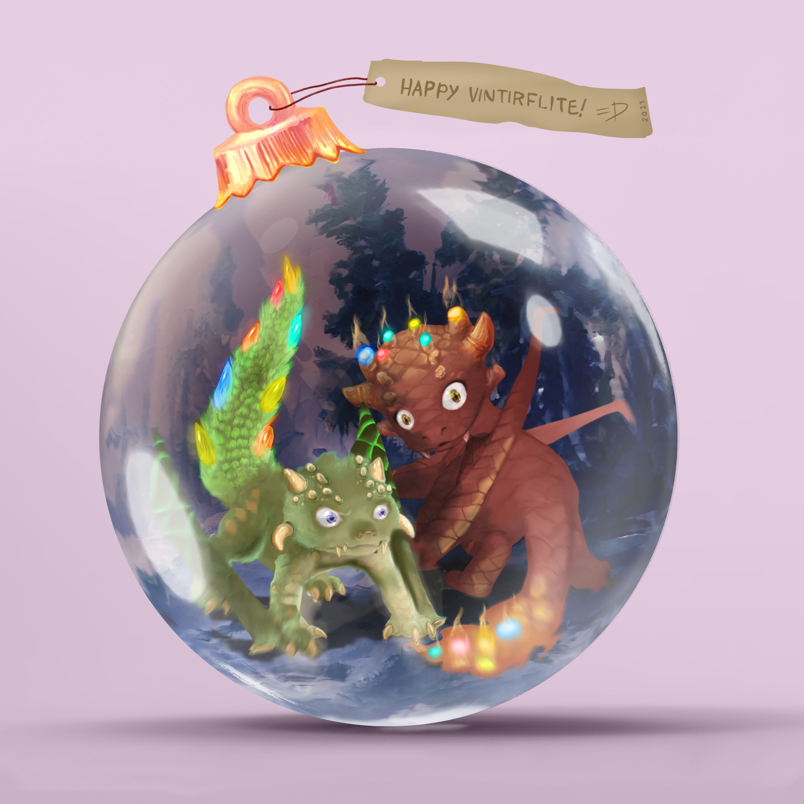 In the world of Yiden, Vintirflite heralds feasts and celebrations as the season musters settlers and wanderers from across the tundra to the warmth of their familial homes in preparation for a long wintry rest. As the first snowfall arrives, evergreens are decorated with colorful baubles and beads. Alit, the ancient trees become perfect gathering points to share the myths and legends of Vintirflites past, when Dragons took to the skies guided by their Knightly keepers.